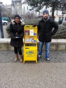 Une Bible par Foyer est une association qui a pour objectif le partage de la Bible et de son message. La Bible est inspirée de Dieu, elle nous explique quel est le plan de Dieu pour l’humanité et qui est Jésus. Des membres de l’Eglise de Brunoy ont a cœur de partager dans la rue leur bonheur de connaitre Jésus. C’est pour faire connaitre et expliquer ce message qu’ils vont dans la rue distribuer des évangiles à l’aide d’un chariot.